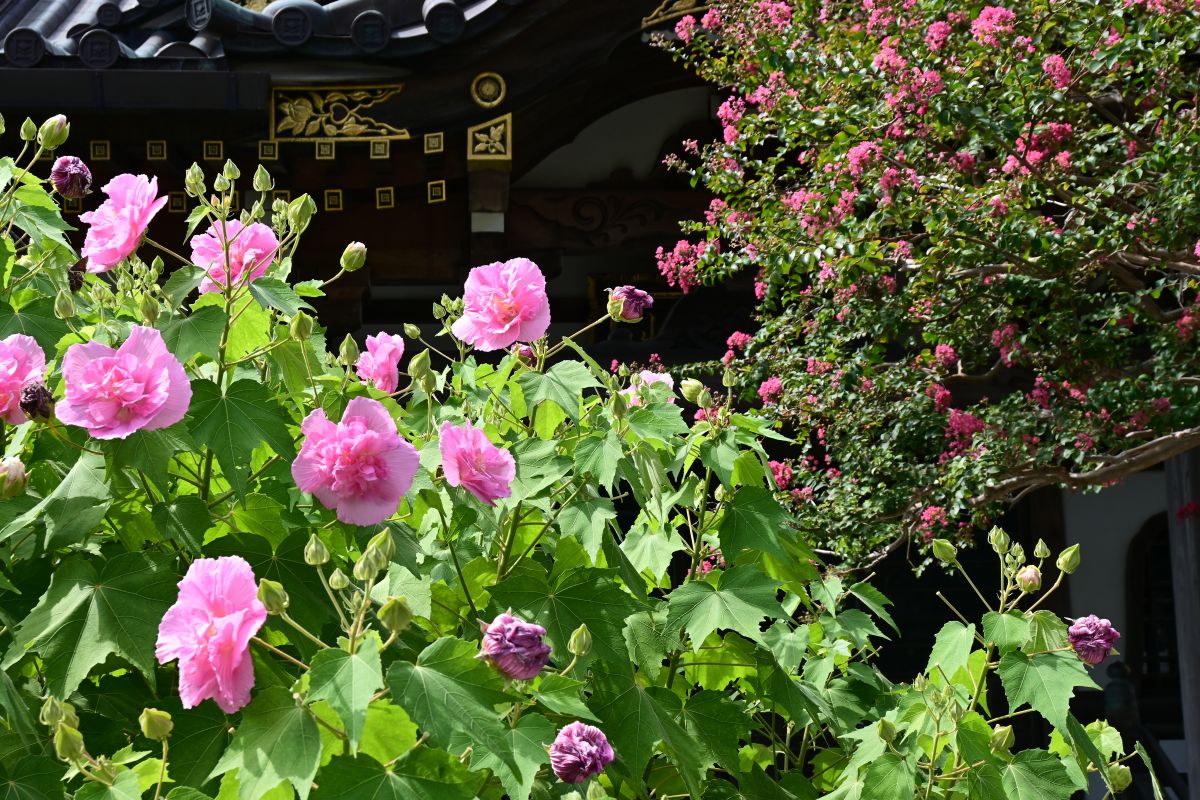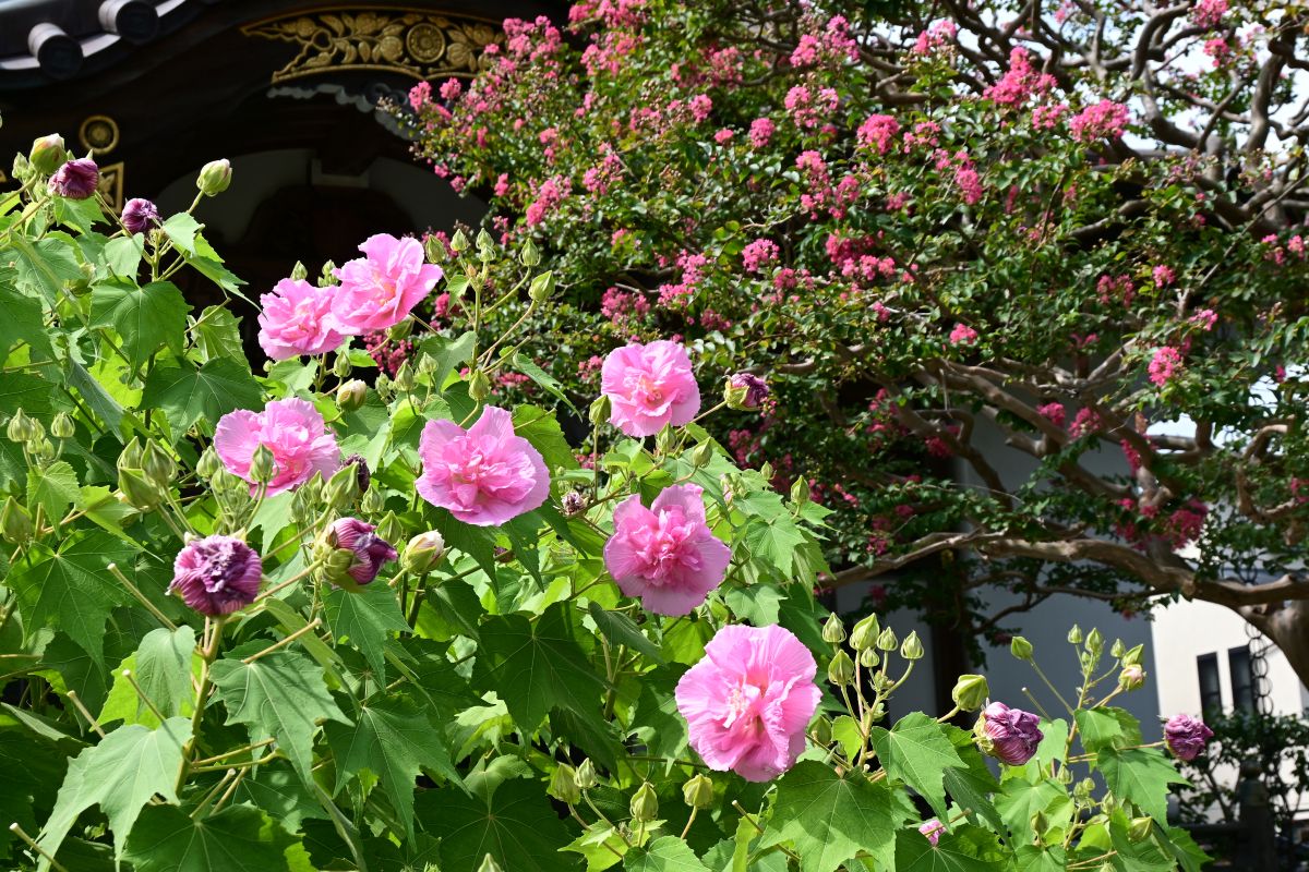 妙隆寺に咲く花はあまり多くはありませんが、夏に咲くフヨウとサルスベリは見逃せません。